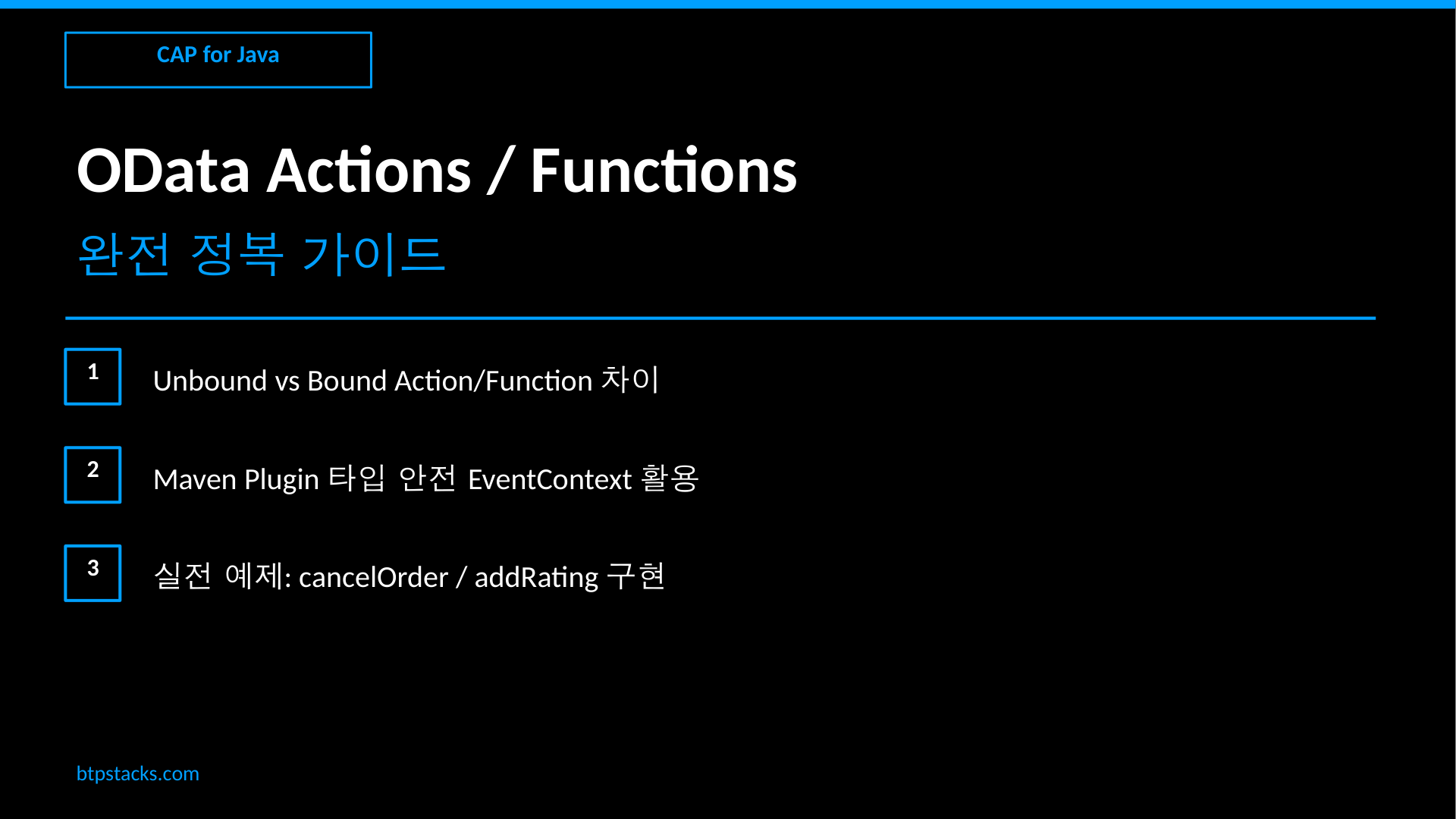 SAP CAP(Cloud Application Programming Model) for Java에서 OData Actions와 Functions는 표준 CRUD 외의 비즈니스 로직을 서비스로 노출하는 핵심 메커니즘입니다. 주문 취소, 평점 등록, 통계 조회처럼 엔티티 단순 조작을 넘어서는 작업을 깔끔하게 구현할 수 있습니다. 이 튜토리얼에서는 CDS 모델 정의부터 Maven Plugin 기반 타입 안전 EventContext, 실전 핸들러 구현까지 전 과정을 다룹니다.