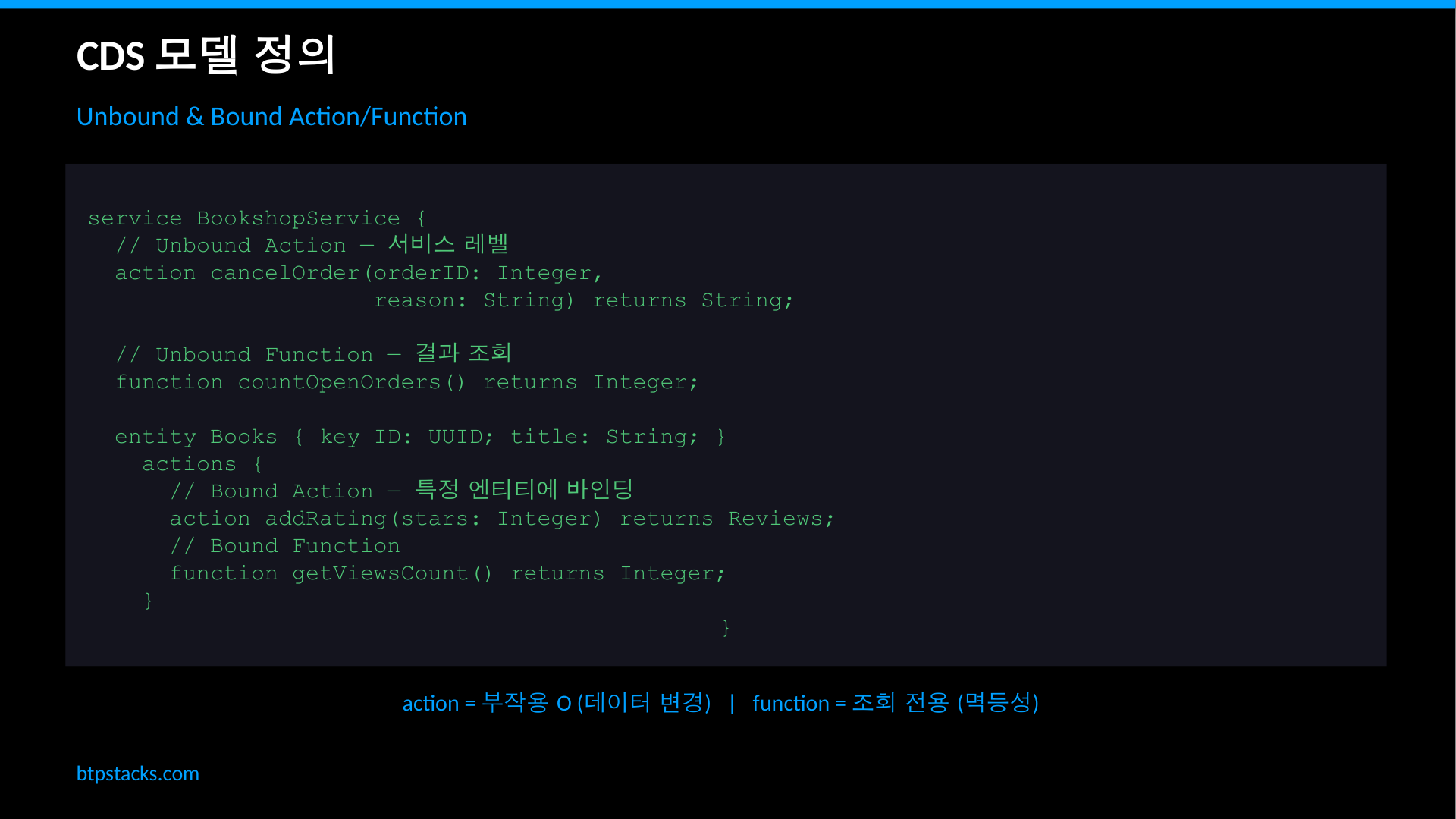 - CDS에서 Unbound/Bound Action과 Function을 정의할 수 있다